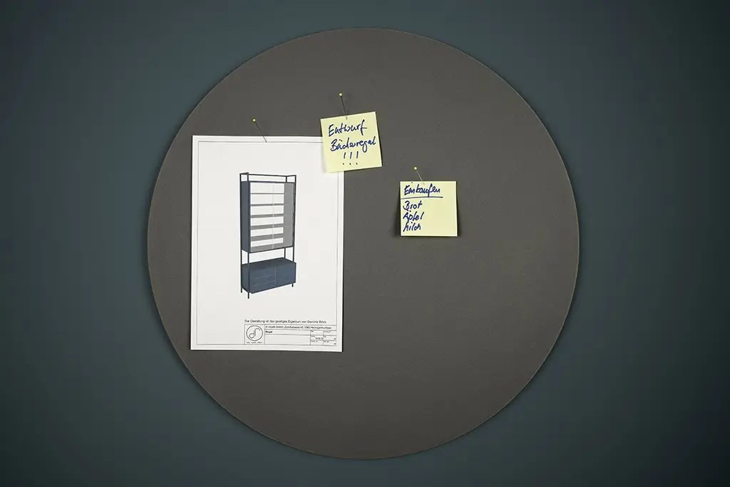 Kreisrunde, randlose Pinnwand aus Birkensperrholz mit einer Oberfläche aus Linoleum.
